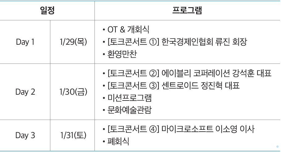 이번 캠프의 핵심은 급변하는 글로벌 환경 속에서 청년들이 스스로 가능성을 발견하고, 우리 사회를 이끌어갈 기업가정신을 체득하도록 돕는 데 있다. 스타트업 CEO부터 군인, 변호사, 개발자까지 각기 다른 배경을 가진 150명의 청년은 ‘경계를 너머 내일을 상상하다’라는 슬로건 아래, 리더들의 인사이트를 공유하며 미래 리더가 갖춰야 할 핵심 역량을 체득했다. 특히, 2박 3일간 이어진 릴레이 토크콘서트는 경영철학, 투자, 기술, 리더십을 아우르는 깊이 있는 인사이트의 장이었다. 각 분야를 대표하는 연사들은 청년들에게 필요한 리더의 자질을 생생한 목소리로 전달했다. 각기 다른 직업과 배경을 가진 청년들은 ‘더 나은 미래’라는 공통의 목표 아래 끈끈한 네트워크를 형성하며 캠프의 의미를 더했다.
